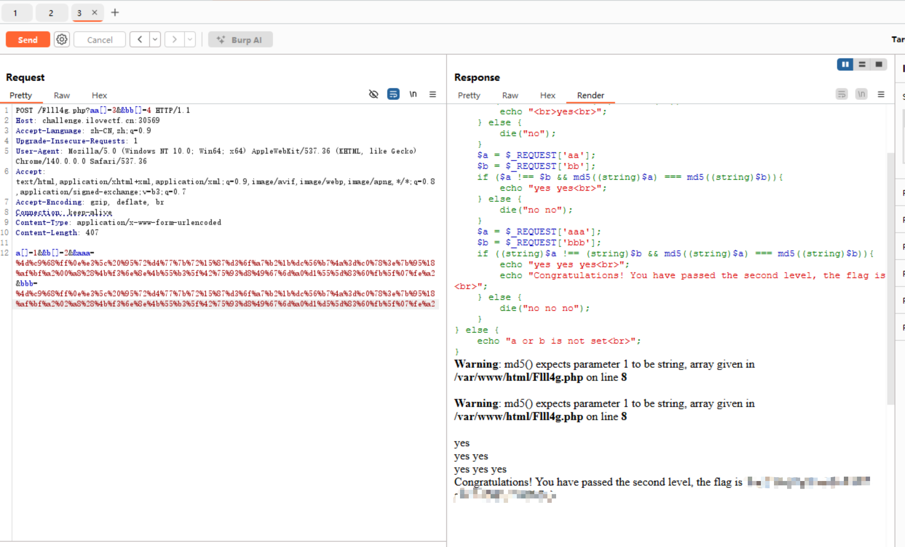 1 2 3 4 5 6 7 8 9 10 11 12 13 14 15 16 17 18 19 20 21 22 23 24 25 26 27 28 29 30 <?php highlight_file (__FILE__ );include ('flag.php' );$a = $_POST ['a' ];$b = $_POST ['b' ];if (isset ($a ) && isset ($b )){ if ($a !== $b && md5 ($a ) == md5 ($b )){ echo "<br>yes<br>" ; } else { die ("no" ); } $a = $_REQUEST ['aa' ]; $b = $_REQUEST ['bb' ]; if ($a !== $b && md5 ((string )$a ) === md5 ((string )$b )){ echo "yes yes<br>" ; } else { die ("no no" ); } $a = $_REQUEST ['aaa' ]; $b = $_REQUEST ['bbb' ]; if ((string )$a !== (string )$b && md5 ((string )$a ) === md5 ((string )$b )){ echo "yes yes yes<br>" ; echo "Congratulations! You have passed the second level, the flag is " .$flag ."<br>" ; } else { die ("no no no" ); } } else { echo "a or b is not set<br>" ; }