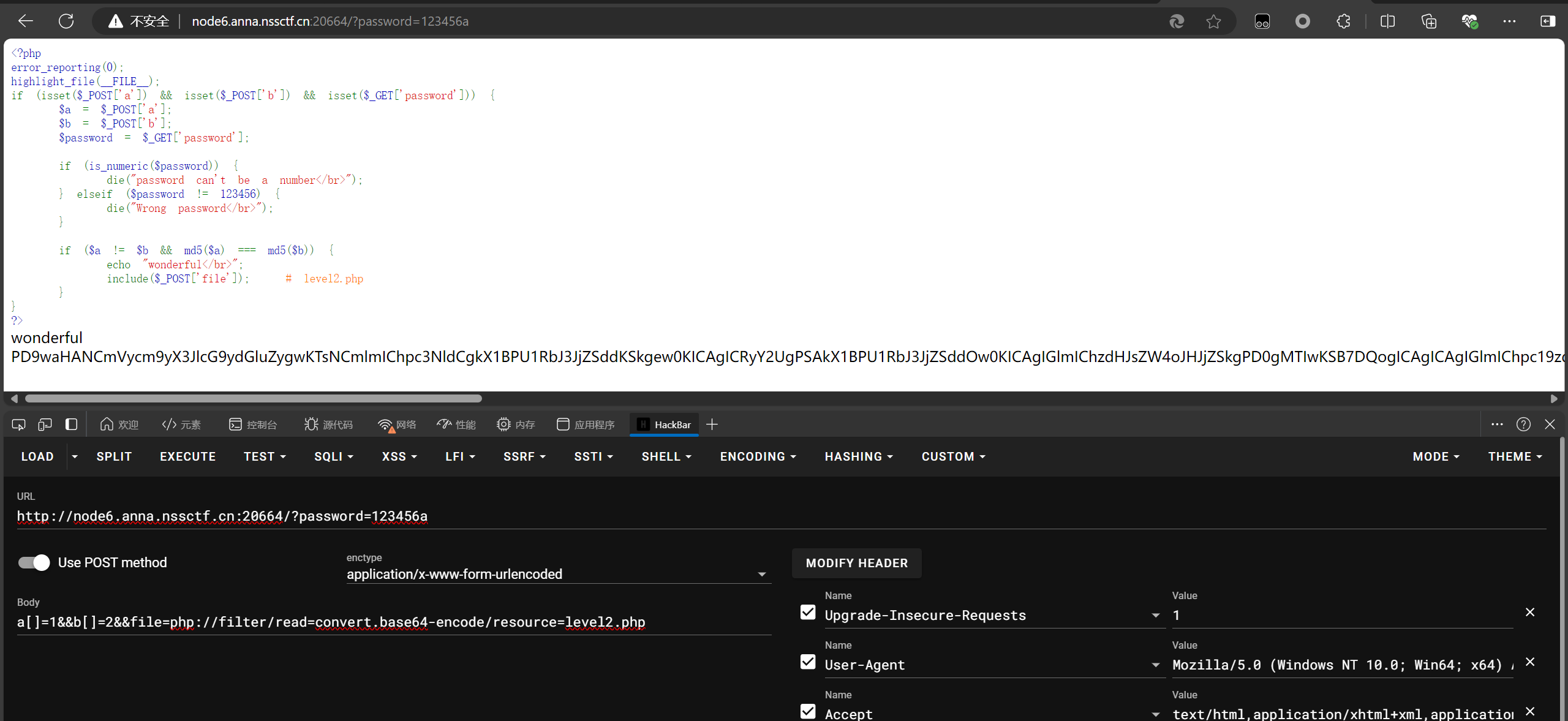 第一关,传a,b,password,比较简单,password绕过is_numeric函数,只要加一个.就可以,然后md5可以用数组绕过,不是强等